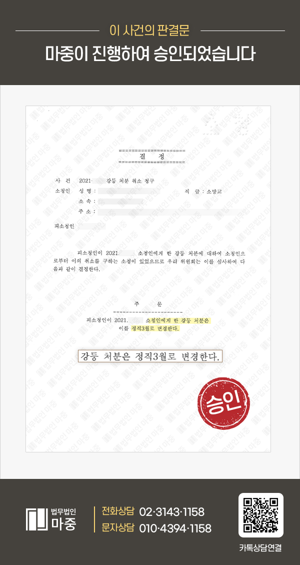 의뢰인께서도 승진시험과 동료 소방공무원들과의 관계 등에 대해서도 걱정을 덜 수 있게 되었다고 감사의 뜻을 표해주셨습니다. 마중을 믿고 함께해주셔서 진심으로 감사드립니다.
